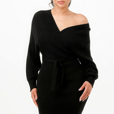 Off Shoulder Wrap Belted Ribbed Sweather Dress